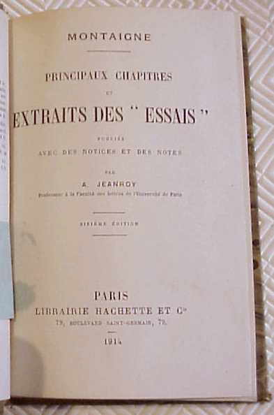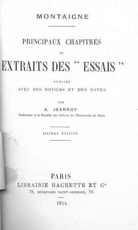 MONTAIGNE // PRINCIPAUX CHAPITRES // et // EXTRAITS DES "ESSAIS" // publiés // AVEC DES NOTICES ET DES NOTES // par // A. JEANROY // Professeur à la Faculté des lettres de l’Université de Paris // sixième édition // PARIS //LIBRAIRIE HACHETTE ET Cie // 79, boulevard saint-germain, 79 // 1914.